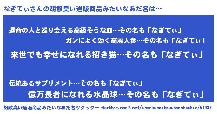 | 意味不明あだ名 | 『永久保存なぎてぃ』『ペロリンなぎてぃ』 |