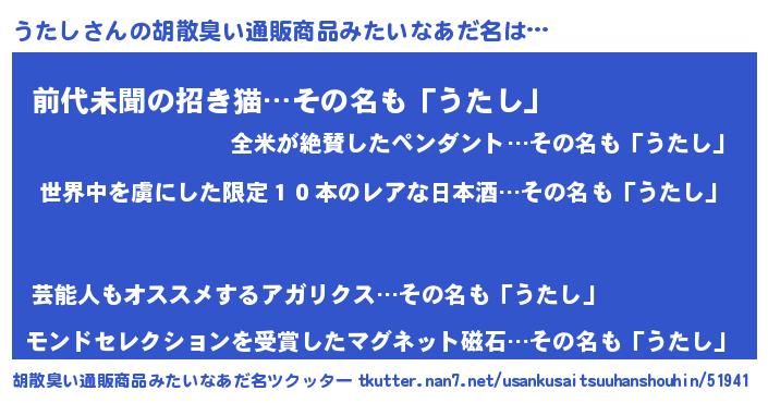 | 意味不明あだ名 | 『住所不定無職うたし(56歳)』『自称うたし』 |