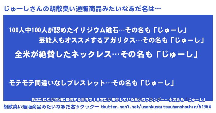 | 男性向けラノベタイトル風あだ名 | 『じゅーし~年齢イコール彼女いない歴の魔法使い~』 |