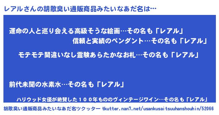 | 男性向けラノベタイトル風あだ名 | 『レアルの憂鬱』『魔弾の王とレアル』 |