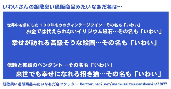 | 女子向けラノベタイトル風あだ名 | 『いわいの雑貨屋さん』『いわい恋絵巻』 |