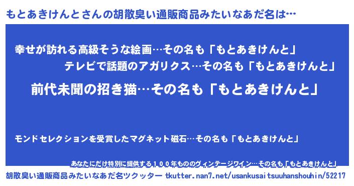 | 男性向けラノベタイトル風あだ名 | 『もとあきけんと~年齢イコール彼女いない歴の魔法使い~』 |