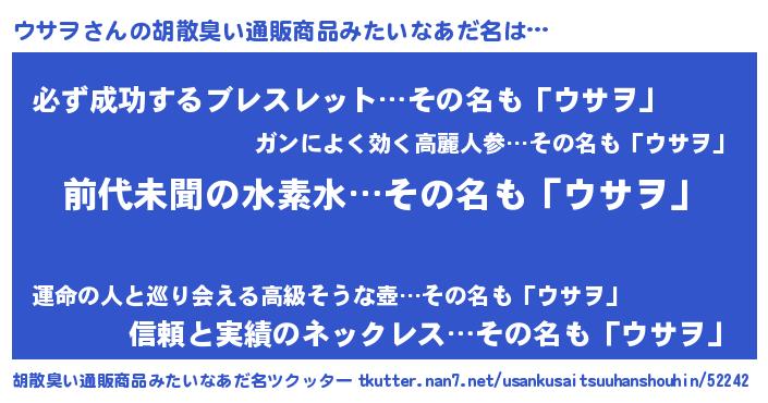 | ヘコむあだ名 | 『ウサヲ(遠い目)』『ウサふぇ~』 |