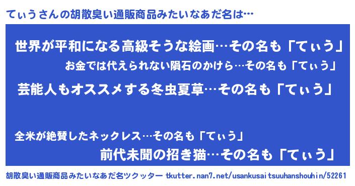 | 意味不明あだ名 | 『自称てぃう』『てぃうフォーエバー』 |