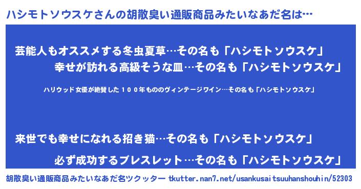 | 欧米人風あだ名 | 『ダレノガレハシモトソウスケ』 |