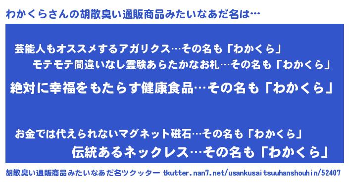 | ヘコむあだ名 | 『わかくら(爆)』『わかっ子』『牛乳』 |