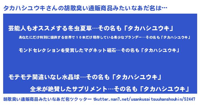 | 男性向けラノベタイトル風あだ名 | 『ノーゲーム・ノータカハシユウキ』 |
