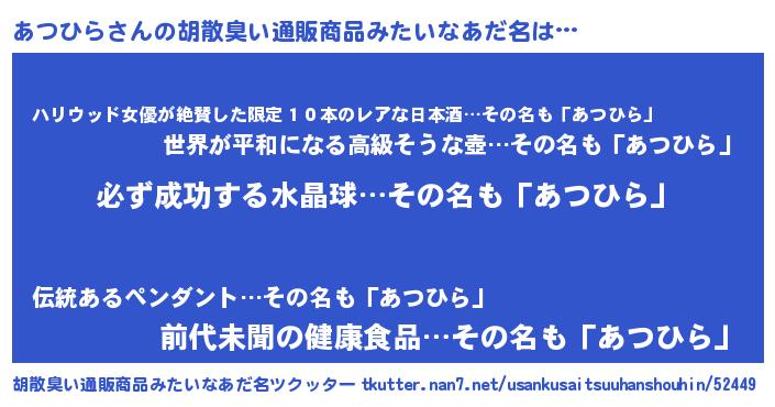 あつひらさんの胡散臭い通販商品みたいなあだ名をツクッター!