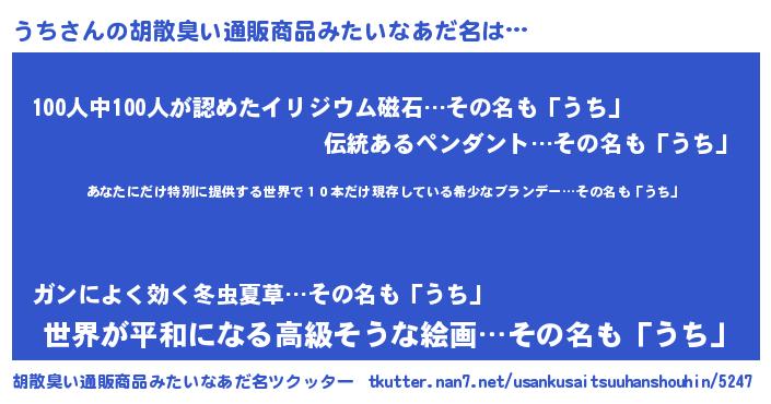 | 男性向けラノベタイトル風あだ名 | 『この素晴らしい世界にうちを!』 |