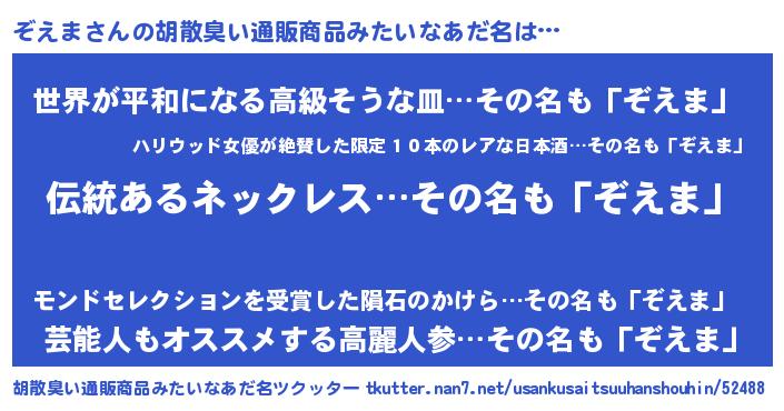 | 男性向けラノベタイトル風あだ名 | 『ぞえまの嫁は女の子じゃないと思った?』 |