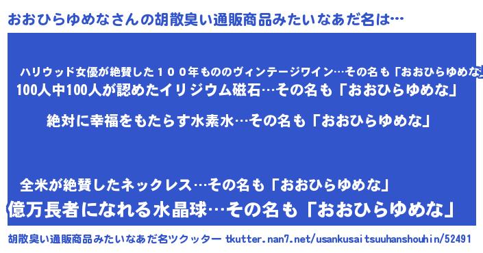 | ヘコむあだ名 | 『おおひらゆめな(苦笑)』『おおふぇ~』 |