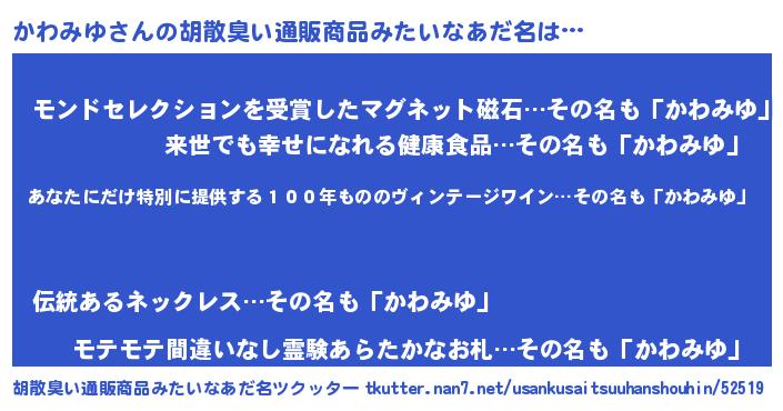 | 意味不明あだ名 | 『住所不定無職かわみゆ(12歳)』 |
