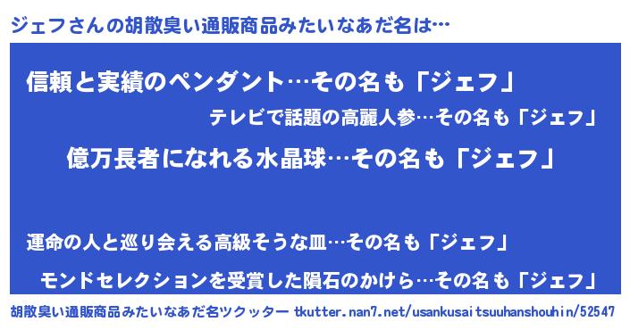 | ヘコむあだ名 | 『ジェふぇ~』『ジェぷりん』 |