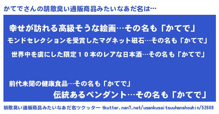 | 意味不明あだ名 | 『住所不定無職かてで(56歳)』 |