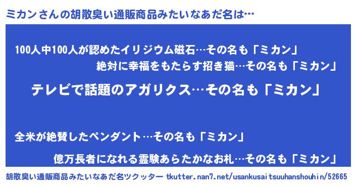 | 女子向けラノベタイトル風あだ名 | 『闇のミカン』『ミカン夫妻のなれそめ』 |