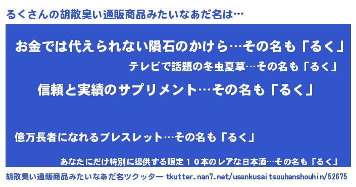 | 女子向けラノベタイトル風あだ名 | 『るくは平凡を望む』『死神るくの再婚』 |
