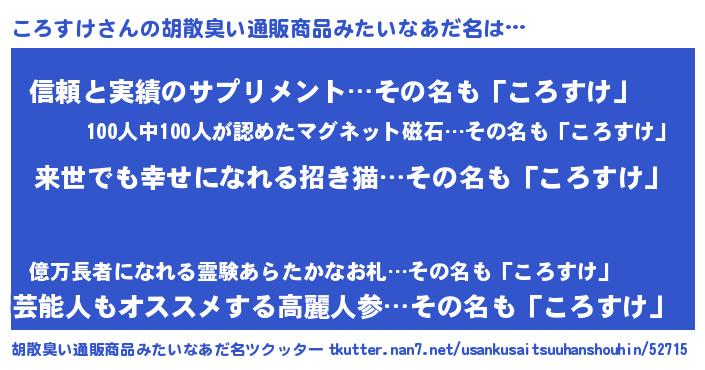 | 男性向けラノベタイトル風あだ名 | 『ころすけという概念が存在しない退屈な世界 』 |