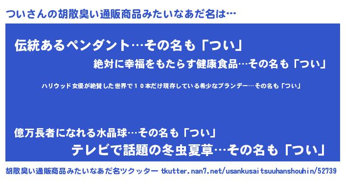 | 意味不明あだ名 | 『住所不定無職つい(71歳)』『自称つい』 |