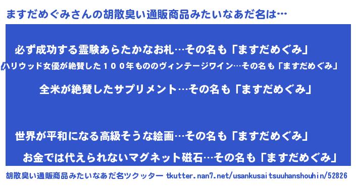 | 男性向けラノベタイトル風あだ名 | 『ますだめぐみの嫁は女の子じゃないと思った?』 |
