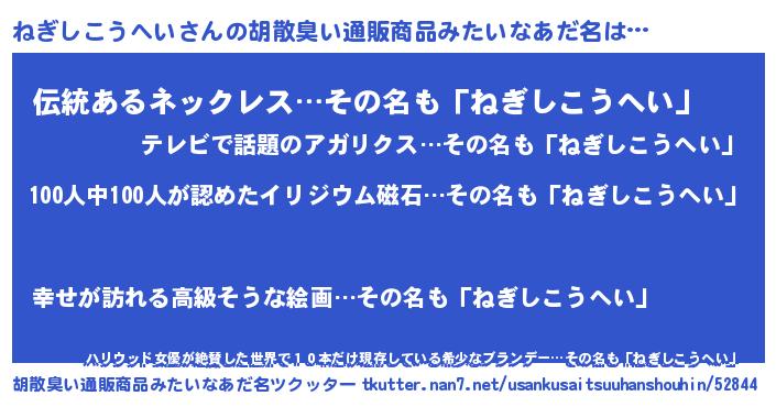 | 男性向けラノベタイトル風あだ名 | 『おまえをオタクにしてやるから、俺をねぎしこうへいにしてくれ! 』 |