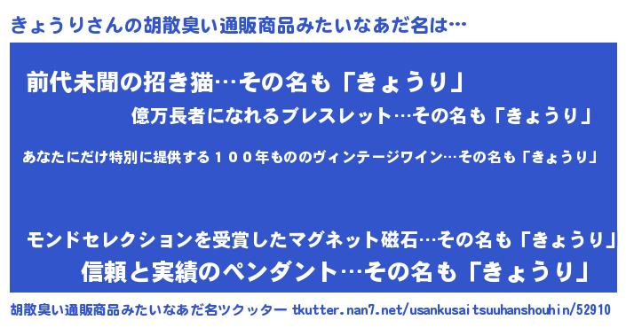 | 意味不明あだ名 | 『住所不定無職きょうり(13歳)』 |