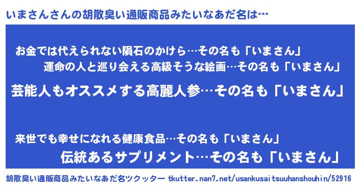 | ヘコむあだ名 | 『いま太郎』『なまこ酢』『いまにー』 |