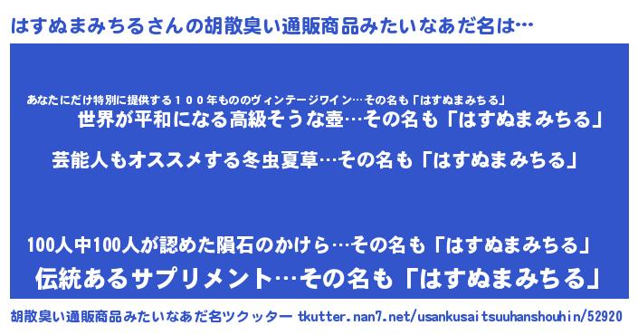 | 男性向けラノベタイトル風あだ名 | 『Re:はすぬまみちるから始める異世界生活』 |