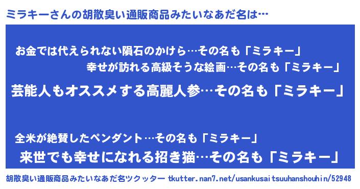 | 意味不明あだ名 | 『自称ミラキー』『永久保存ミラキー』 |