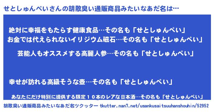 | 男性向けラノベタイトル風あだ名 | 『Re:せとしゅんぺいから始める異世界生活』 |