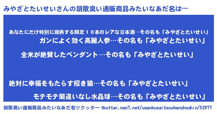 | 男性向けラノベタイトル風あだ名 | 『みやざとたいせいの嫁は女の子じゃないと思った?』 |
