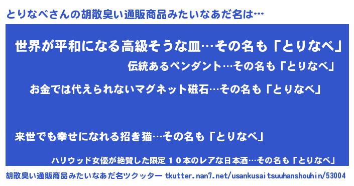 | 男性向けラノベタイトル風あだ名 | 『とりなべに滅ぼされるだけの簡単なお仕事です』 |