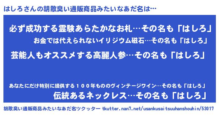 | 意味不明あだ名 | 『自称はしろ』『ペロリンはしろ』 |