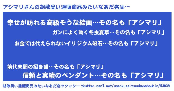 | 女子向けラノベタイトル風あだ名 | 『アシマリ恋絵巻』『アシマリの婚約者』 |