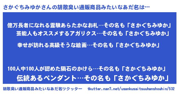 | 男性向けラノベタイトル風あだ名 | 『やはりさかぐちみゆかの青春ラブコメはまちがっている 』 |