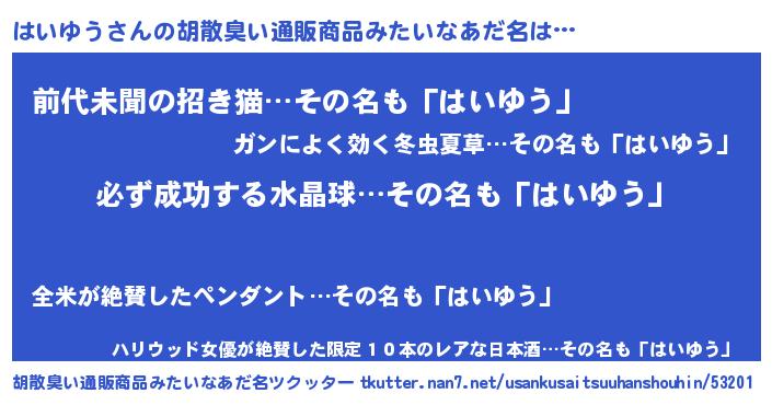 | 男性向けラノベタイトル風あだ名 | 『はいゆうの憂鬱』『魔弾の王とはいゆう』 |
