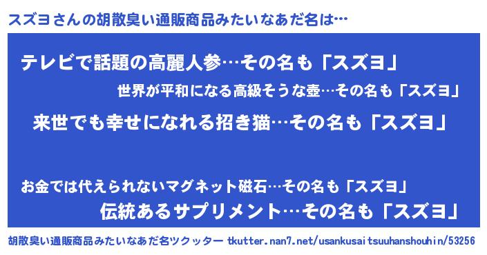 | 意味不明あだ名 | 『永久保存スズヨ』『自称スズヨ』 |