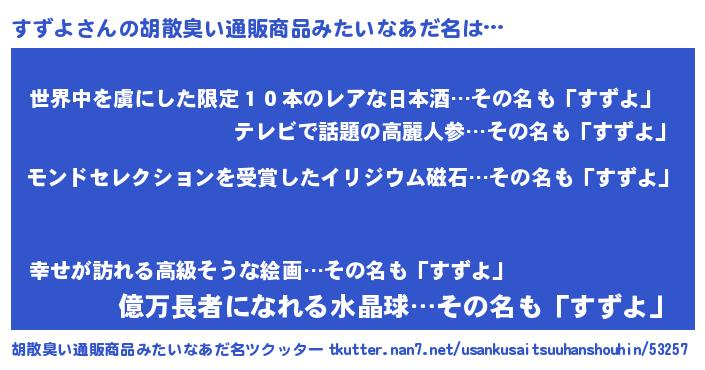 | ヘコむあだ名 | 『すずもー』『豆乳』『すず太郎』 |