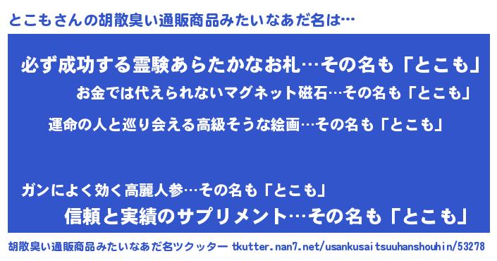 | 意味不明あだ名 | 『とこもフォーエバー』『ペロリンとこも』 |