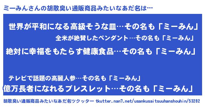 | 男性向けラノベタイトル風あだ名 | 『ミーみんという概念が存在しない退屈な世界 』 |