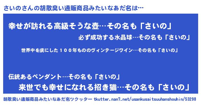 | 意味不明あだ名 | 『住所不定無職さいの(4歳)』 |