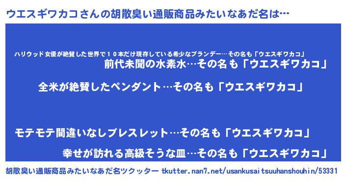 | 欧米人風あだ名 | 『ウサインウエスギワカコ』 |