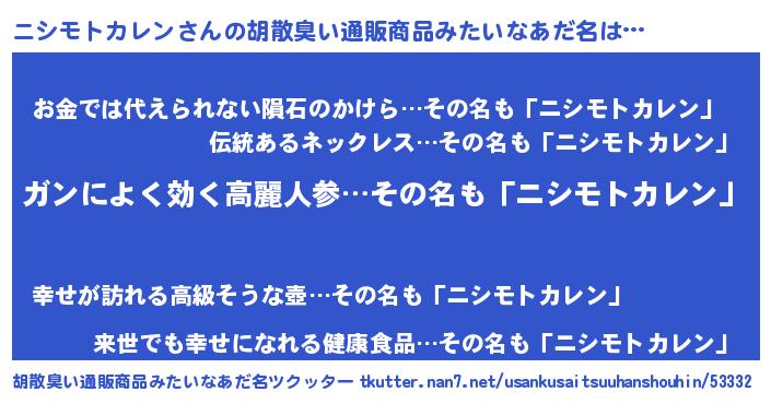 | ヘコむあだ名 | 『ニシモトカレン(笑)』『ニシぷりん』 |