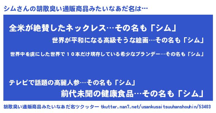 | 意味不明あだ名 | 『住所不定無職シム(95歳)』『永久保存シム』 |