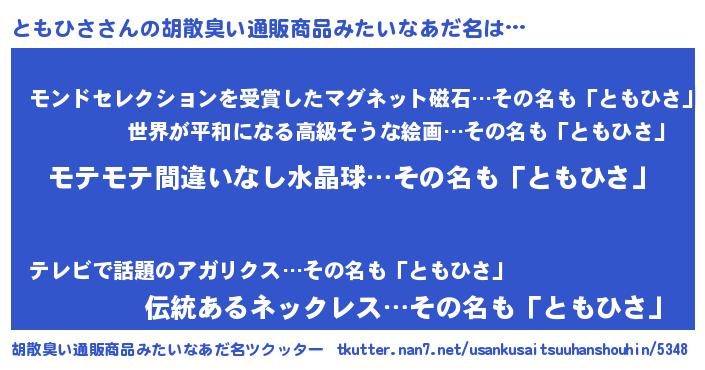 | 男性向けラノベタイトル風あだ名 | 『ともひさに滅ぼされるだけの簡単なお仕事です』 |