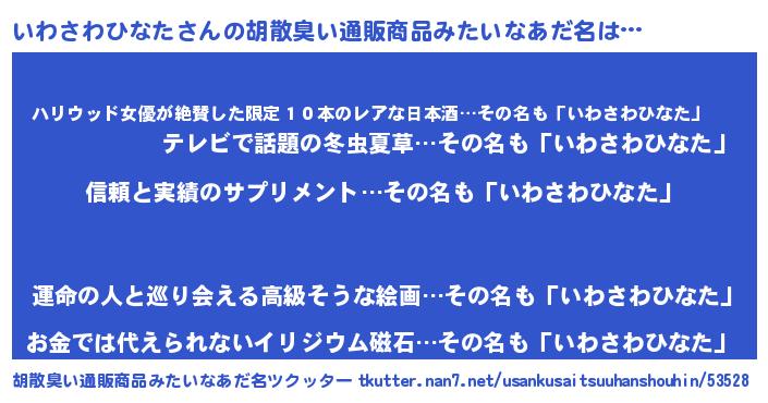 | 男性向けラノベタイトル風あだ名 | 『イワサワヒナタスレイヤー』 |