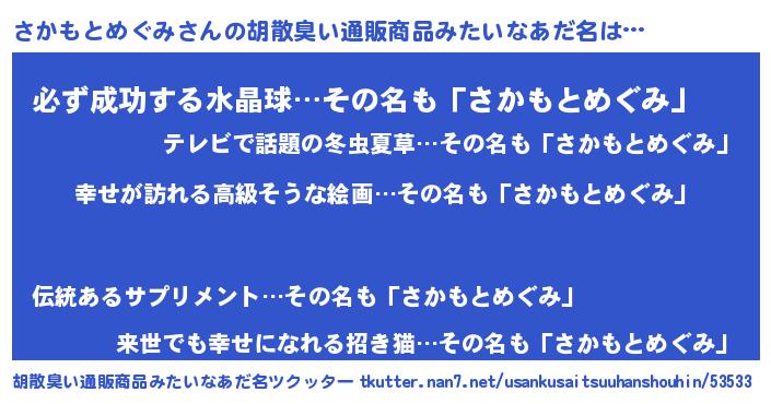 | 男性向けラノベタイトル風あだ名 | 『やはりさかもとめぐみの青春ラブコメはまちがっている 』 |