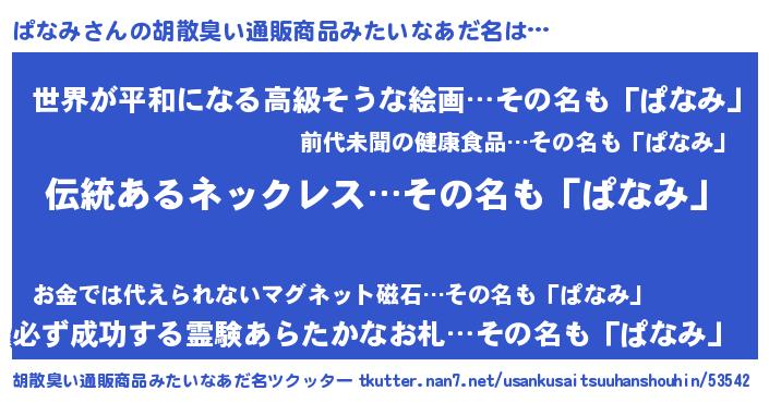 | 意味不明あだ名 | 『とにかく怪しいぱなみ』 |