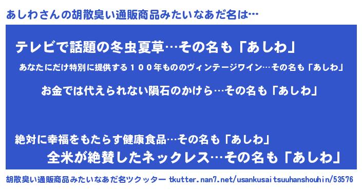 | ヒーロー風カッコイイあだ名 | 『愛の使者あしわ』『サイバー戦士アシワ』 |