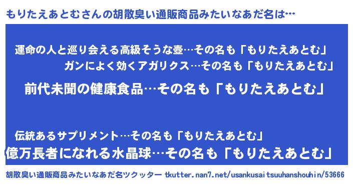 | ヘコむあだ名 | 『もりたえあとむ(爆)』『酢こんぶ』 |