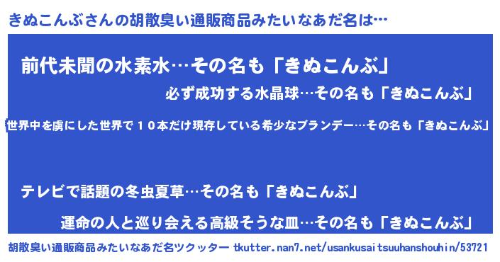 | 意味不明あだ名 | 『住所不定無職きぬこんぶ(85歳)』 |